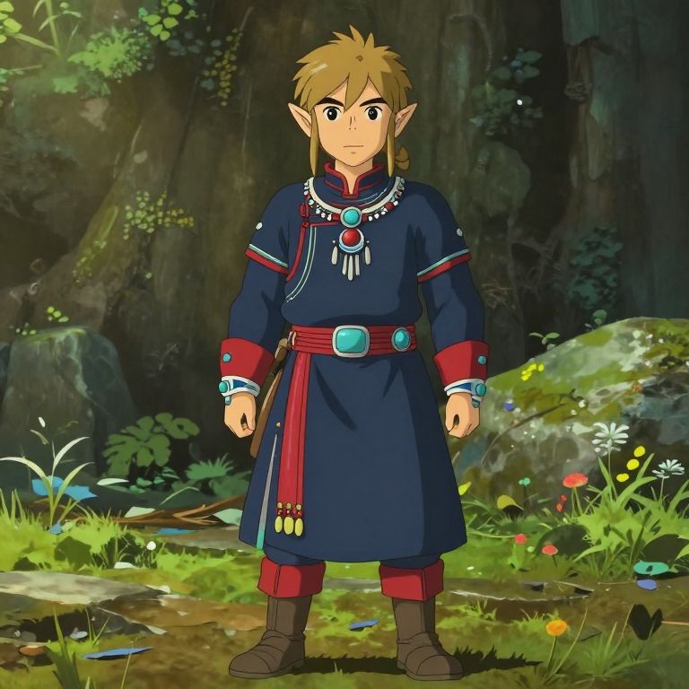Full body anime-style illustration of a character inspired by Link from Breath of the Wild, dressed in dark blue and red traditional Mongolian-inspired clothing with ethnic jewelry and ornaments including earrings and bracelets, rendered in Studio Ghibli animation style, standing in a lush forest setting.