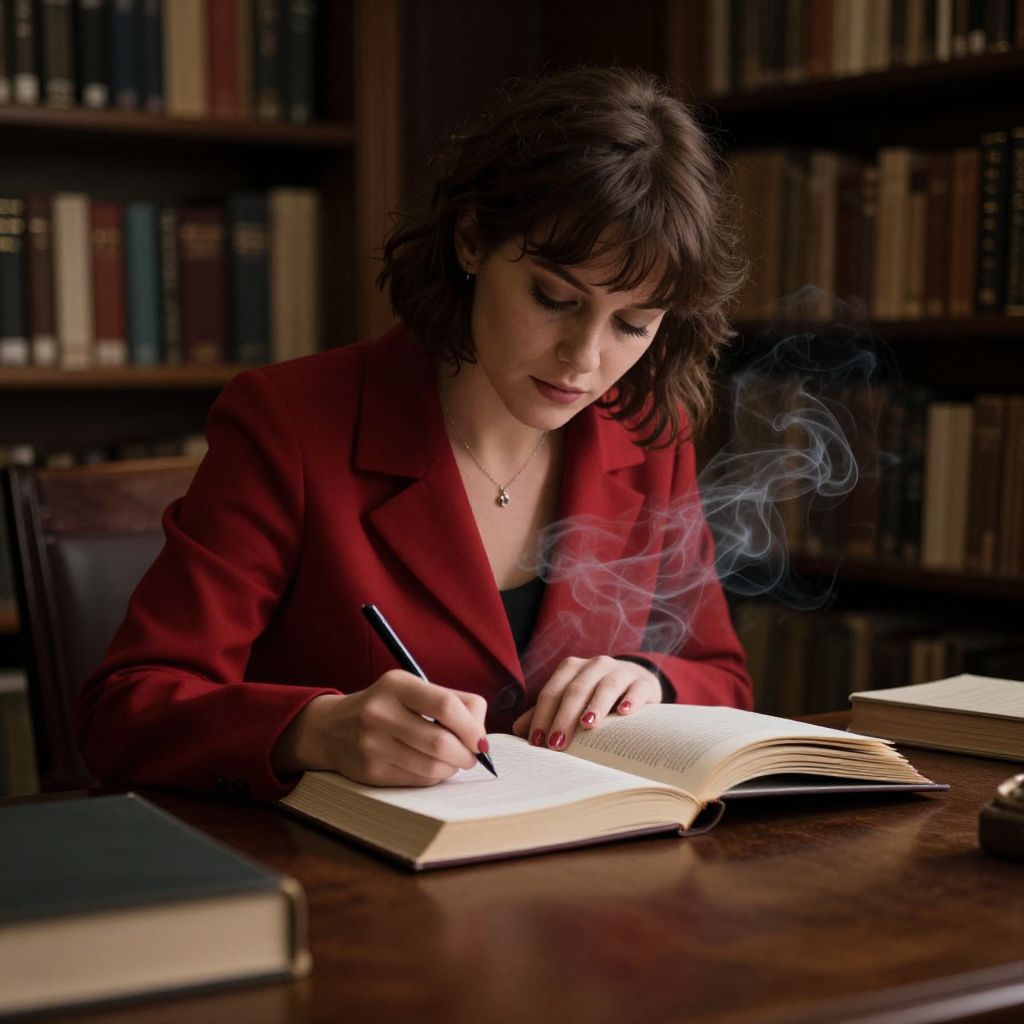 In a dimly lit library, a woman in a red blazer pensively writes in an open book as wisps of ethereal smoke rise from its pages, defying the boundaries between ink and imagination.