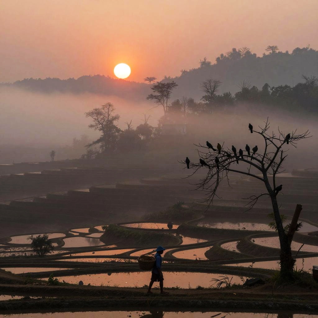 Banwatti at dawn with mist rolling over terraced fields, solitary farmer walking with a basket, bright red and orange sunrise illuminating the fog, exotic birds perched on branches, detailed natural elements creating a mystical and calm rural morning atmosphere.