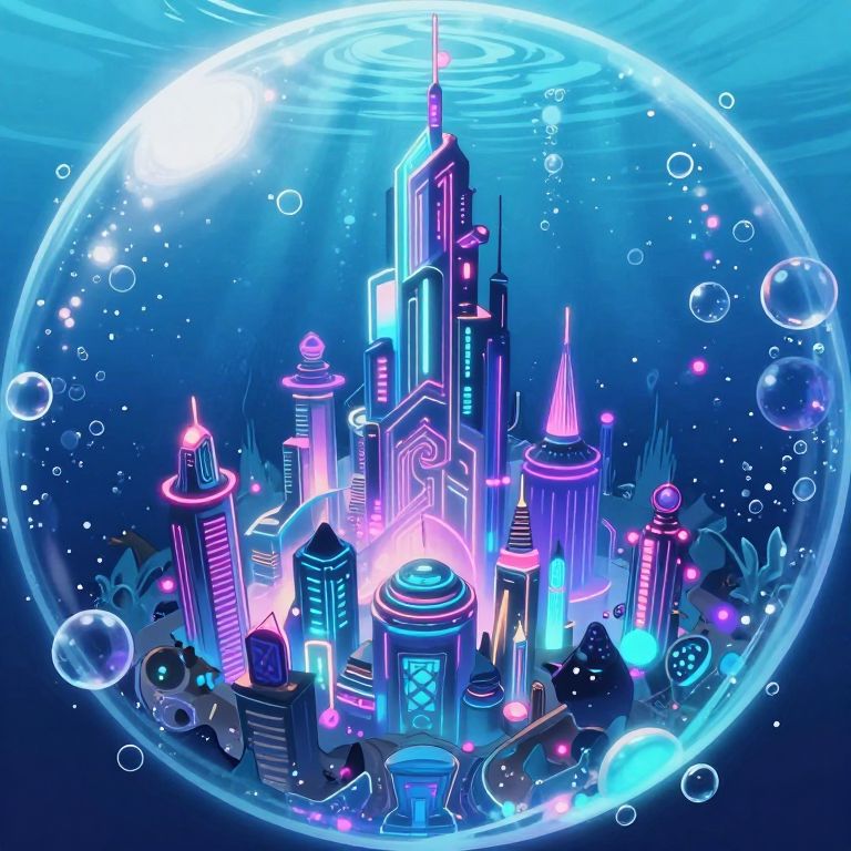 Vibrant underwater cityscape digital art: futuristic buildings with pastel colors, winding paths, bubbles, colorful fish, and coral reefs. Bright,