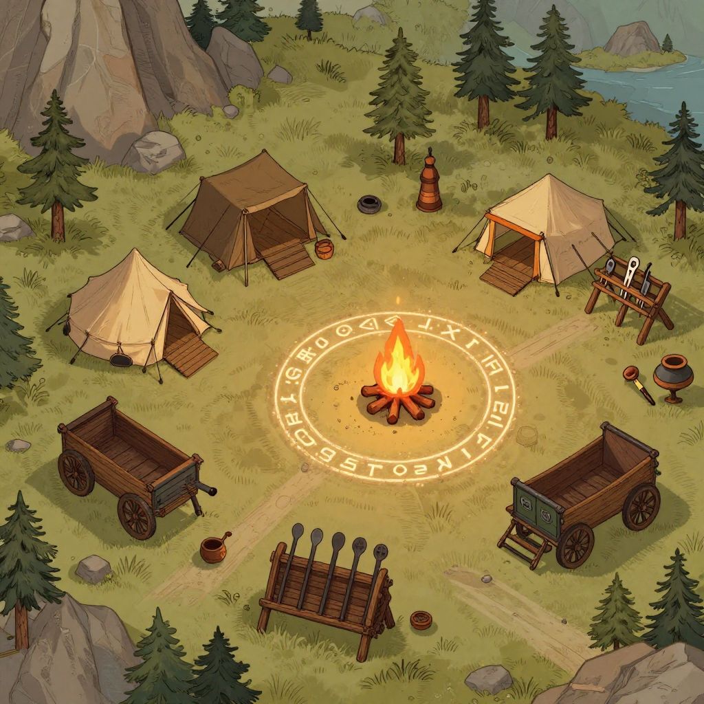 Camp DnD map showing a rugged outdoor adventurer's camp near a mountain base, illustrated with tents, wooden carts, weapon racks, a central bonfire, and magical glowing runes, hand-painted style with earthy tones and a touch of fantasy realism.