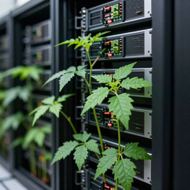 Photograph of a server rack with black metal cabinets. Inside the rack, multiple network devices with small red and green LED lights are visible. Green, serrated-edged plant leaves with thin stems grow through the rack, adding a natural element to the technological setup. The background shows more black server cabinets extending into the distance, creating a sense of depth. The image contrasts the sleek, industrial design of the servers with the organic texture and color of the plant leaves, blending technology and nature.