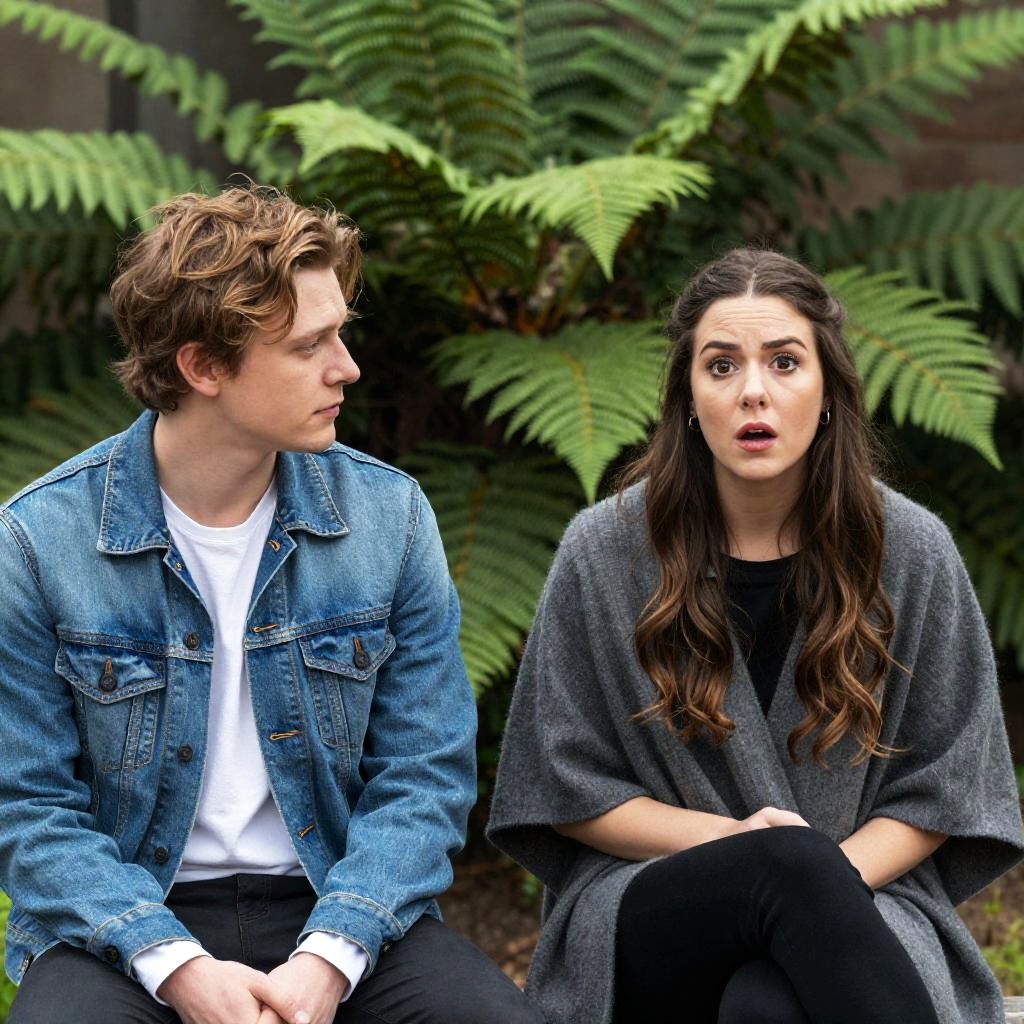 Photograph of two people sitting outdoors among dense green ferns. Man on left with light brown, wavy hair, wearing denim jacket over white shirt, looking at woman. Woman on right with long, wavy brown hair, wearing black shirt and gray poncho, sitting with knee up, looking surprised. Both facing each other. Man's expression neutral, woman's expression intense.