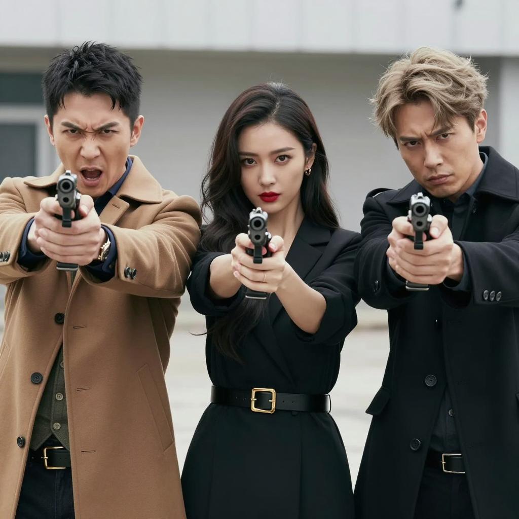 Dynamic action scene with three people. Central man with mustache, brown jacket, gray shirt, holding two lit guns, intense expression. Woman in white dress with long brown hair, right, holding a gun, serious expression. Man in brown jacket, left, holding a gun, neutral expression. Background: yellow-lit columns, falling leaves. Bright, vivid colors, dramatic lighting.