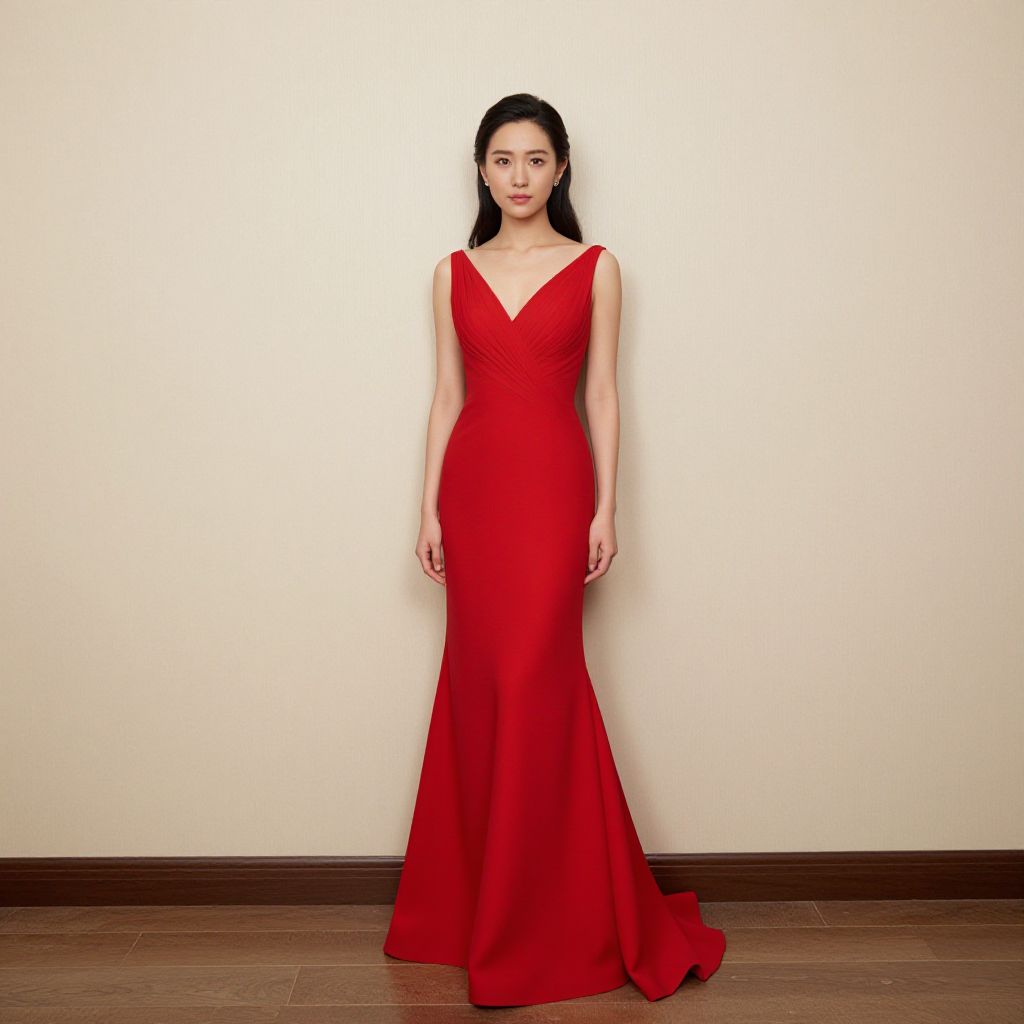 Photograph of a slender Asian woman with long black hair, wearing a sleeveless, V-neck, red evening gown, standing against a plain white wall