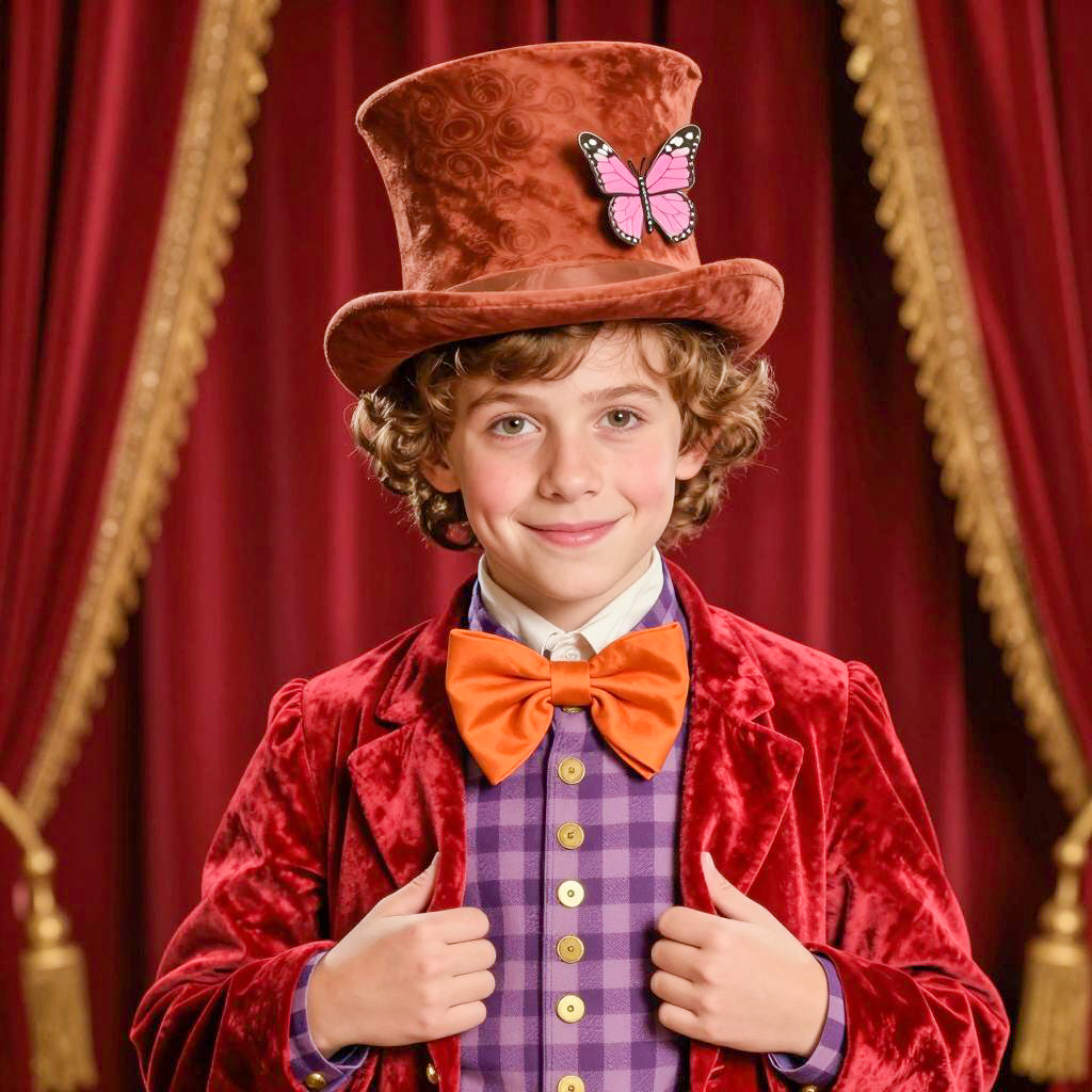 Child willy wonka costume, photograph of a young boy, curly brown hair, wearing a red velvet top hat with a pink butterfly pin, orange bow tie, purple checkered shirt with gold buttons, red velvet jacket, standing in front of a red curtain with ornate gold trim, smiling, hands holding jacket lapels, soft lighting, portrait style, fantasy costume, whimsical, child, traditional clothing, Victorian-inspired, warm colors, detailed ures