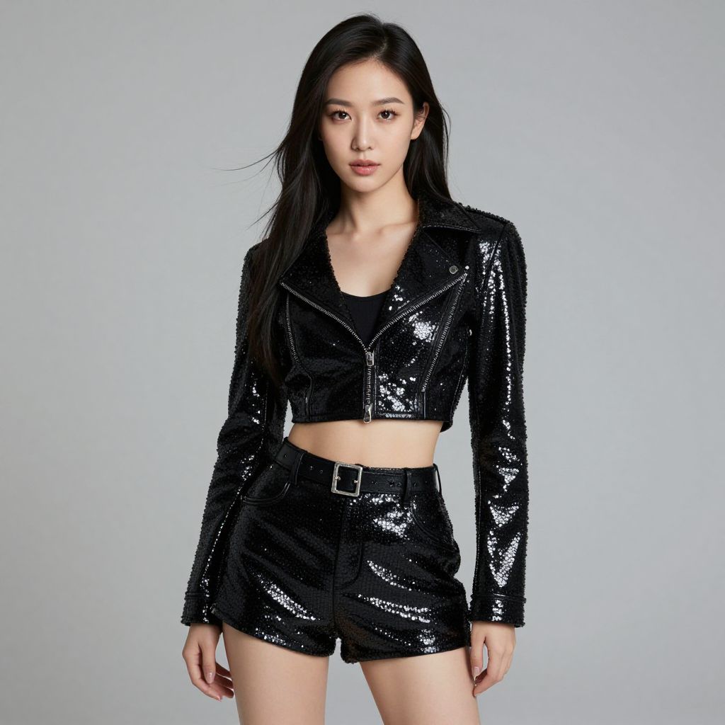 Shining Costume, asian woman in a shiny jacket posing for a picture