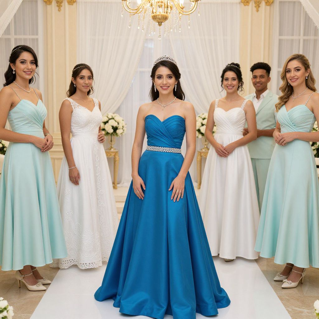 Photograph of six women in a brightly lit, elegant room with a chandelier overhead. The central woman, with dark hair and a tiara, wears a strapless, royal blue, floor-length gown with a beaded belt, and a necklace. Flanking her, five women in light blue and white dresses stand in a semi-circle. The light blue dresses are sleeveless with a slight sheen, while the white dresses are lace-trimmed. They all have jewelry and smile, with white flowers in the background and sheer, white curtains framing the scene. The floor is tiled.