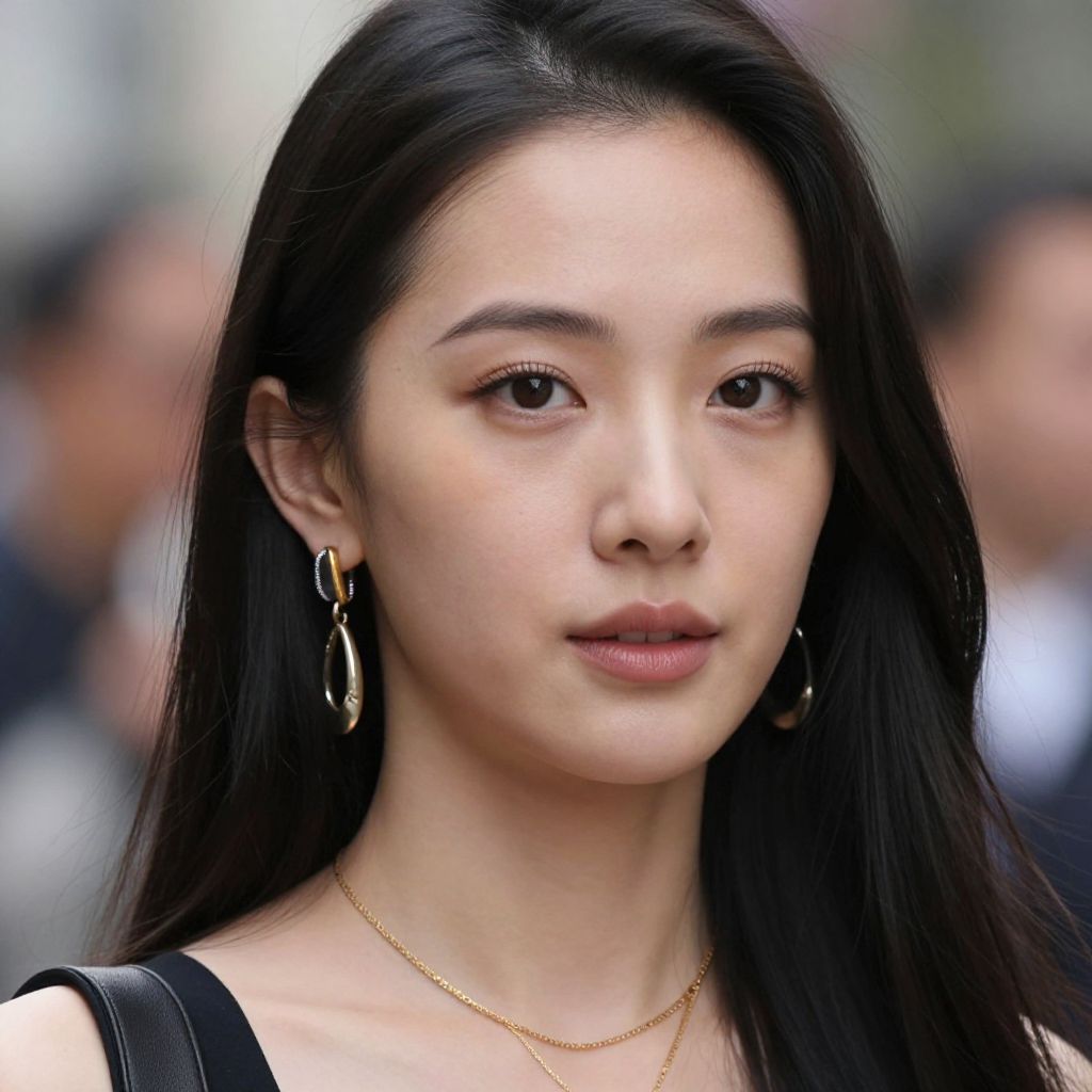 Photograph of a young Asian woman with fair skin, black braided hair, wearing dangling earrings and a black top, standing outdoors with a blurred,