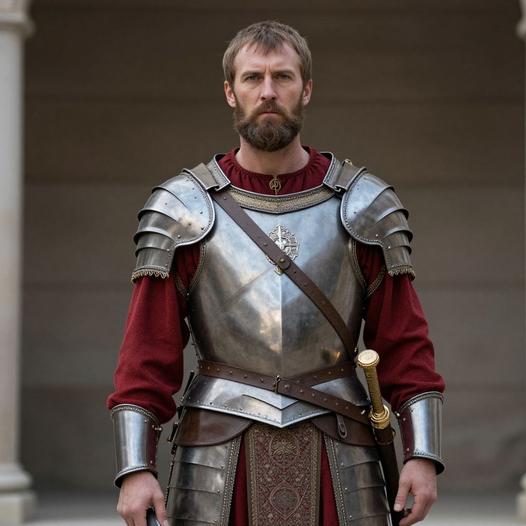 Marcus aurelius costume, man in armor with a beard and a red shirt