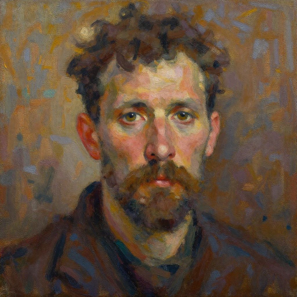 Impressionist-style painting of a bearded man with curly brown hair, intense brown eyes, and a contemplative expression, set against a textured,