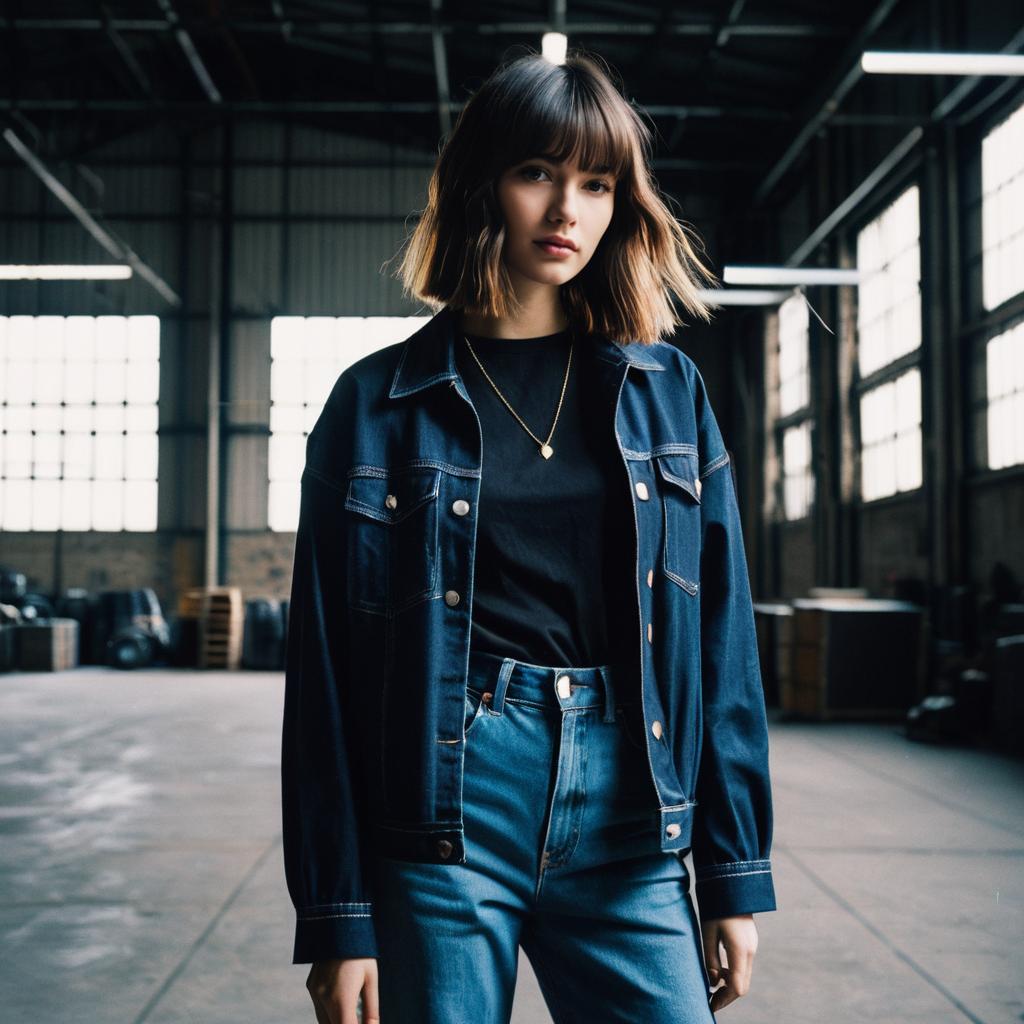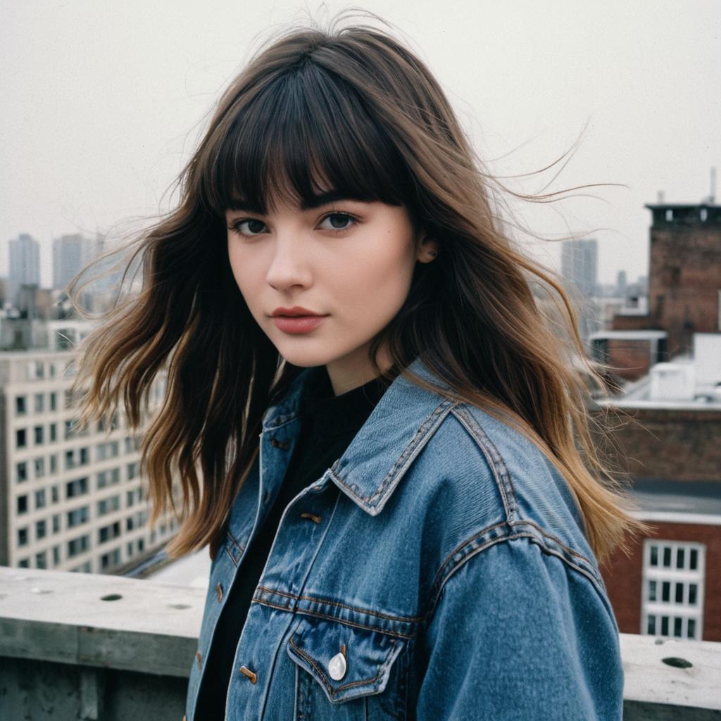 Curtain Bangs hairstyle on young girl, wearing bohemian maxi dress, in botanical garden, captured in fashion editorial style with soft natural light.