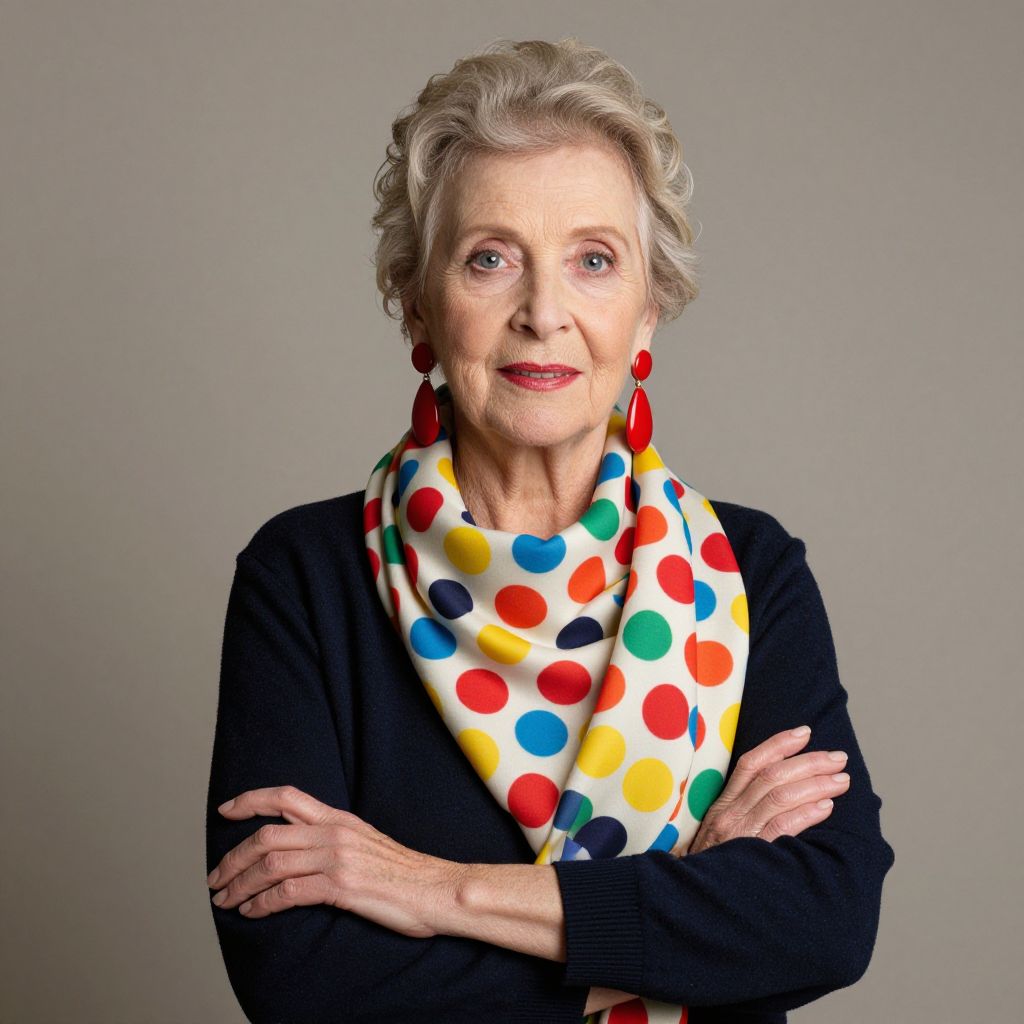 Photograph of an elderly woman with short, curly gray hair, fair skin, and small red earrings. She wears a black long-sleeve top and a white scarf with large, colorful polka dots in red, orange, yellow, and blue. Her arms are crossed over her chest, and she has a slight smile. The background is a simple, solid light gray. The lighting is even, highlighting her serene expression and the vibrant scarf. She has a small gold ring on her right hand.