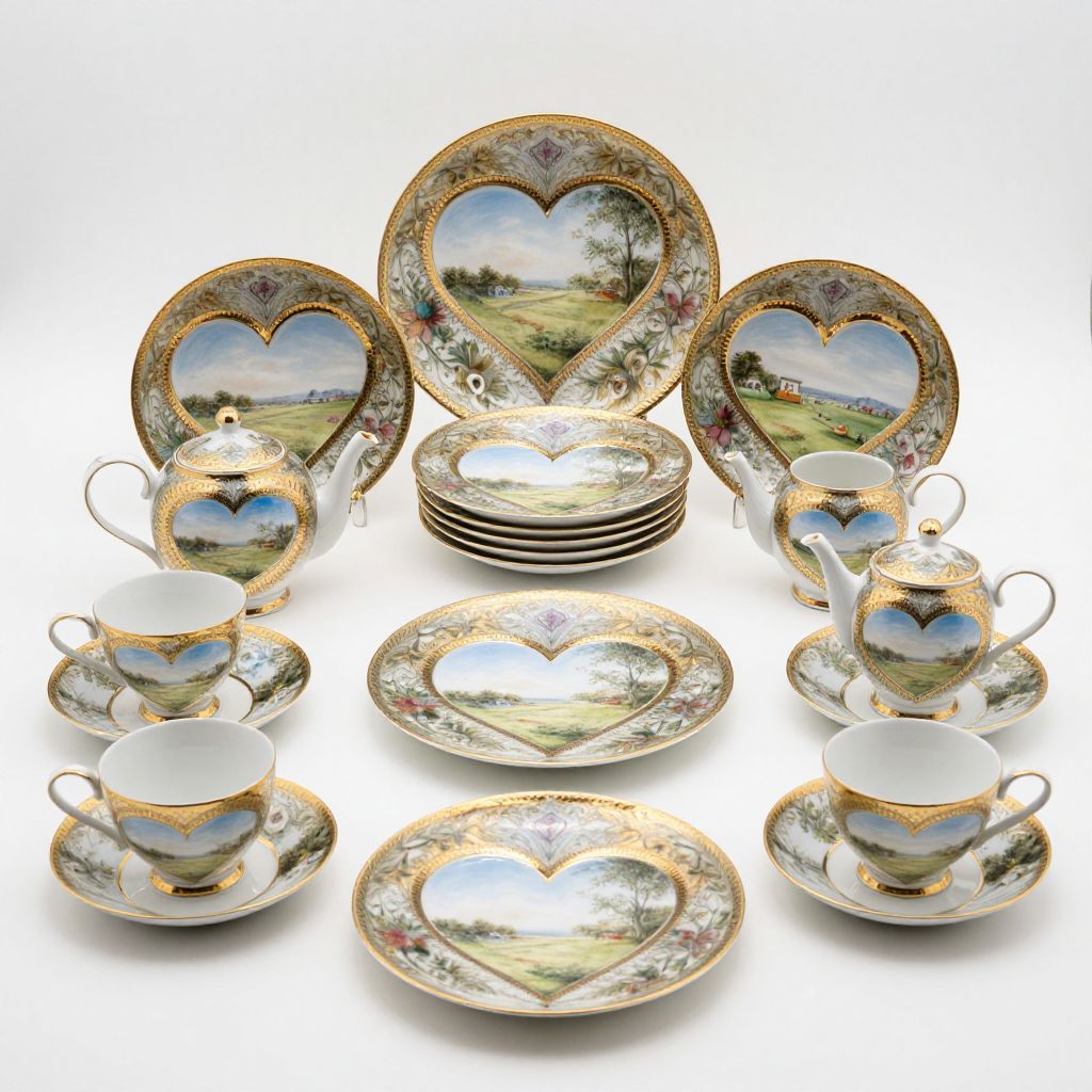 Elegant display of approximately 52 Lowestoft-style porcelain items featuring intricately painted heart-shaped landscapes, gold-trimmed edges, and stacked plates, teapots, cups, and saucers arranged symmetrically on a pristine white surface.