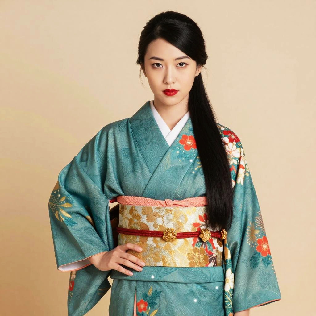 Photograph of an Asian woman with fair skin and long, straight black hair tied in a low ponytail, wearing a teal kimono adorned with red and orange floral patterns and a gold and red obi belt. She has red lipstick and a neutral expression. Her right hand rests on her hip. The background is a plain, light beige color, making her the focal point. The kimono's fabric appears textured and slightly shiny, with intricate floral embroidery on the sleeves and obi. The image has a vibrant, slightly surreal style with high contrast and bright colors.