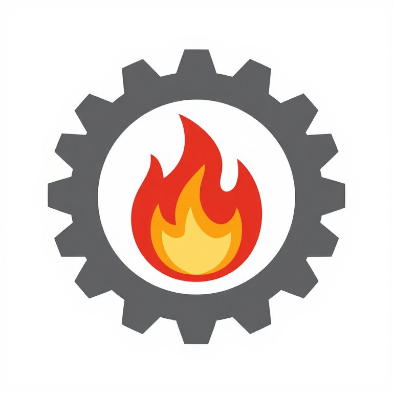 Digital illustration of a gray gear with a vibrant red and yellow flame centered inside, representing energy or power.