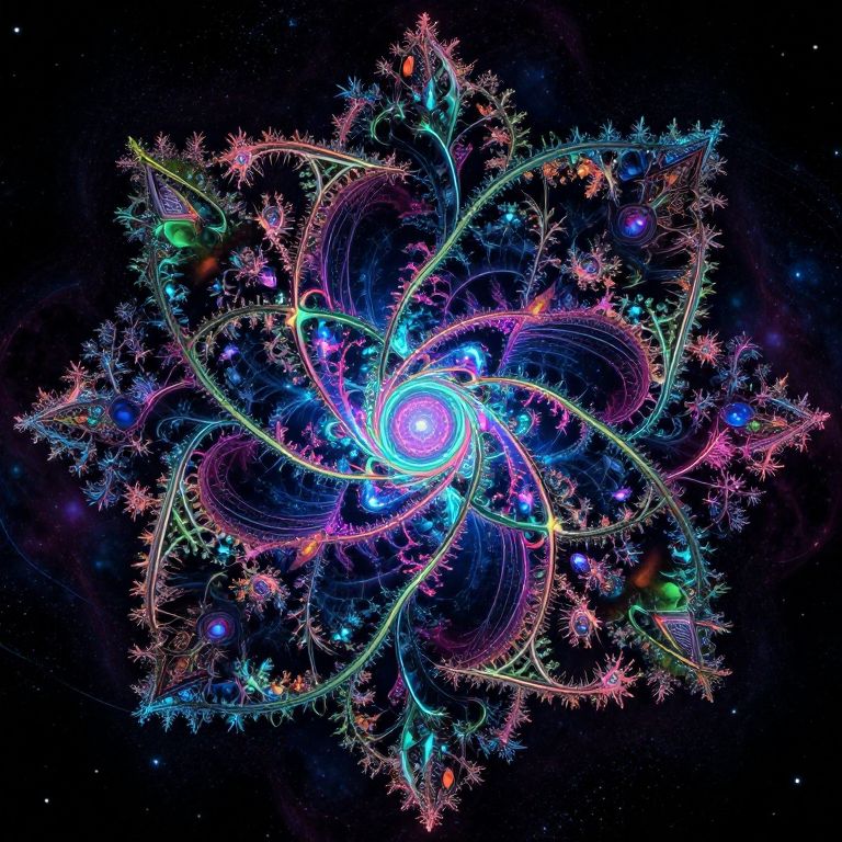 A vibrant digital CGI image depicts a complex, swirling fractal pattern against a black, star-speckled background. Bright, neon colors including blue, purple, pink, and green create intricate, lace-like tendrils that radiate from a glowing, central circular hub. The tendrils twist and intersect, forming a mesmerizing, symmetrical design resembling a cosmic flower or galaxy. Small, multicolored orbs and glowing nodes are scattered throughout, adding depth and dimension. The overall effect is both futuristic and otherworldly, evoking a sense of infinite space and vibrant energy.