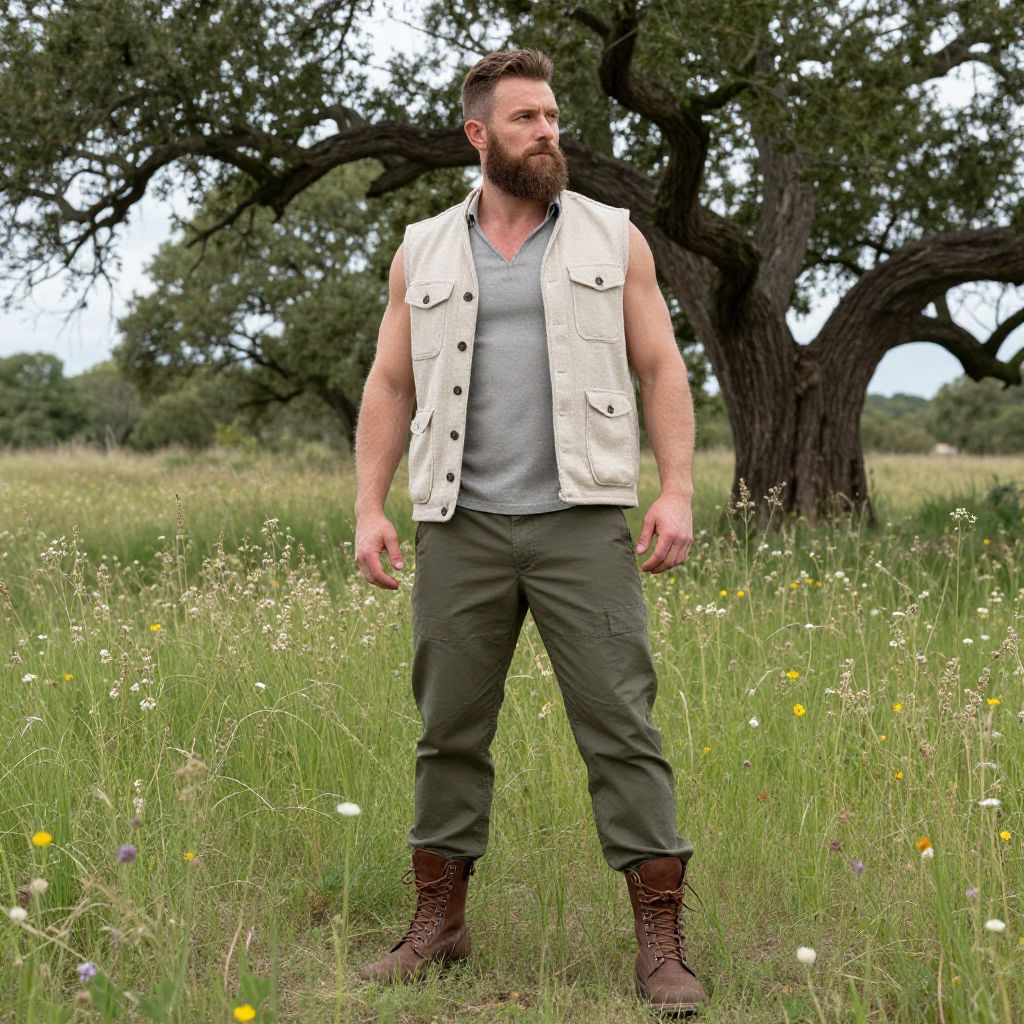 Photograph of a bearded, muscular man with short brown hair standing in a lush meadow filled with wildflowers. He's wearing a beige sleeveless vest over a gray shirt, olive green pants, and brown lace-up boots. The background features large, twisted trees under a cloudy sky. His confident stance and natural surroundings give a rugged, outdoorsy vibe.