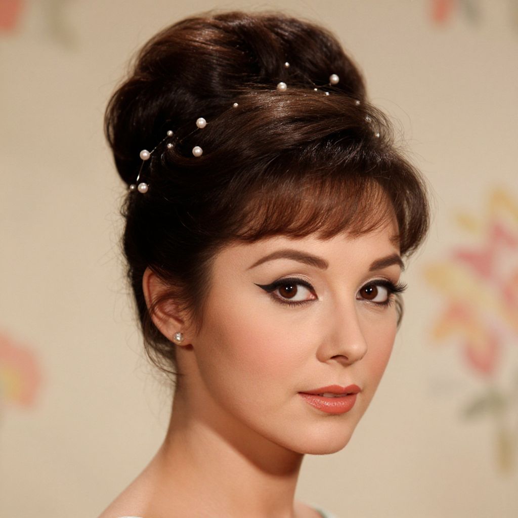 Portrait of a woman wearing a beehive bouffant, styled with delicate pearl pins and a subtle shimmer on the hair, elegant 1960s makeup with winged eyeliner and pale lipstick, soft-focus background with floral patterns