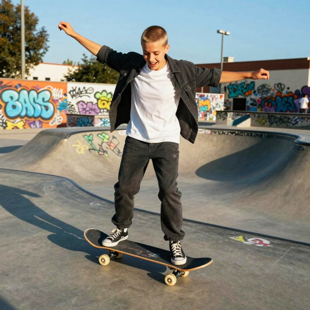 Blond teenager sitting on a skateboard in an urban setting, graffiti walls and industrial buildings in the background, wearing a hoodie and jeans, capturing a rebellious and carefree youthful spirit, dynamic lighting highlighting the blond hair under the golden hour sunlight.