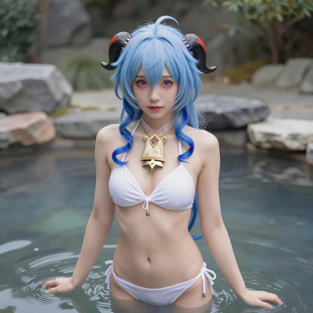 Ganyu \(genshin impact\), outdoors, blue hair, purple eyes, onsen, goat horns, 1girl, long hair, white bikini