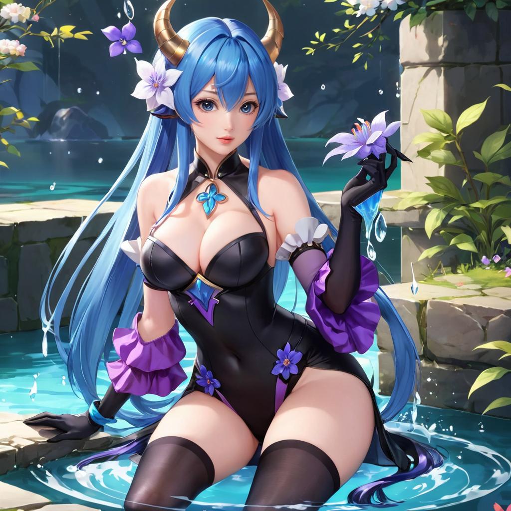 Anime-style digital illustration of a blue-haired, horned girl in a white bikini with purple accents, standing by a hot spring in a mountain village,