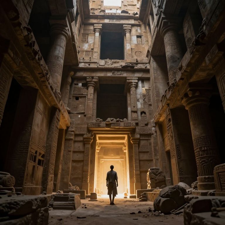Photograph of a silhouette standing in a brightly lit ancient Egyptian temple entrance, surrounded by dark, weathered stone columns and rubble.