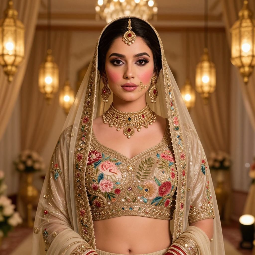 Realistic image of a bride-to-be with fair toned skin, large dark eyes, and soft pink cheeks, wearing a luxurious haldi choli design costume with floral peacock patterns and subtle gold zari detailing, standing in a grand wedding hall with golden lanterns and traditional drapes.