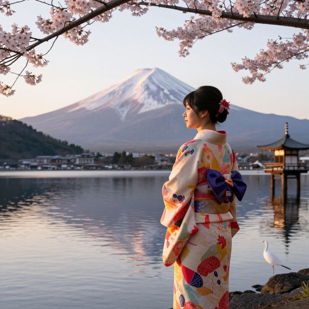 Elegant Japanese woman in a vibrant floral kimono stands gracefully by a serene lake, her gaze directed toward majestic Mount Fuji, framed by blooming cherry blossoms and a tranquil sunset, with a traditional shrine and a white bird adding to the picturesque scene.