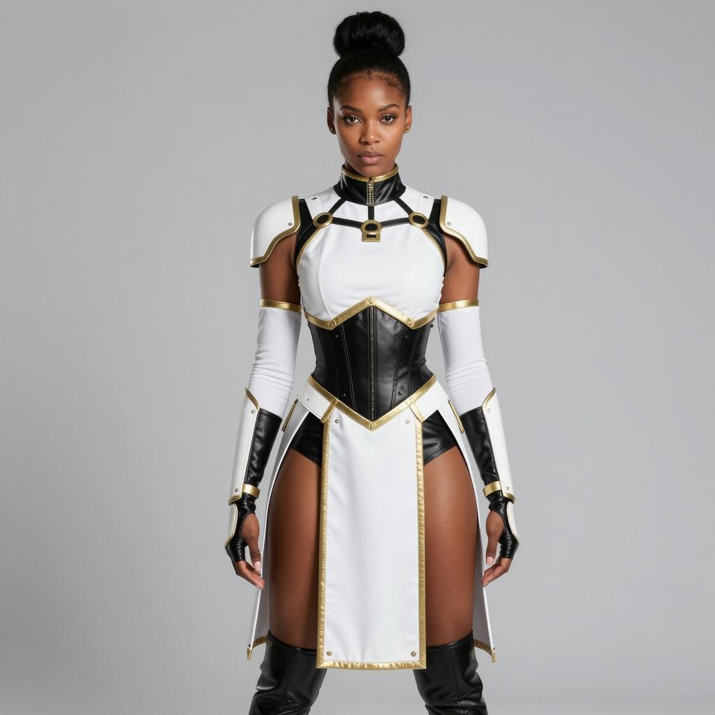 Photograph of a Black woman standing in a studio with a gray background, wearing a white and black futuristic warrior-inspired costume with gold accents. The costume features a high waist, thigh-high slits, black leather straps around the arms and neck, and matching arm guards. The woman has her hair styled in a high bun and wears minimal jewelry, posing confidently with a serious expression.