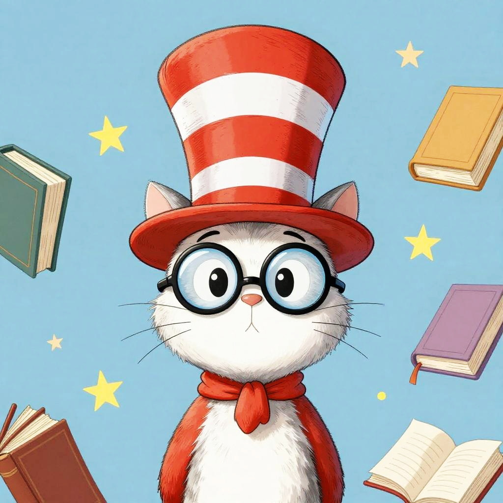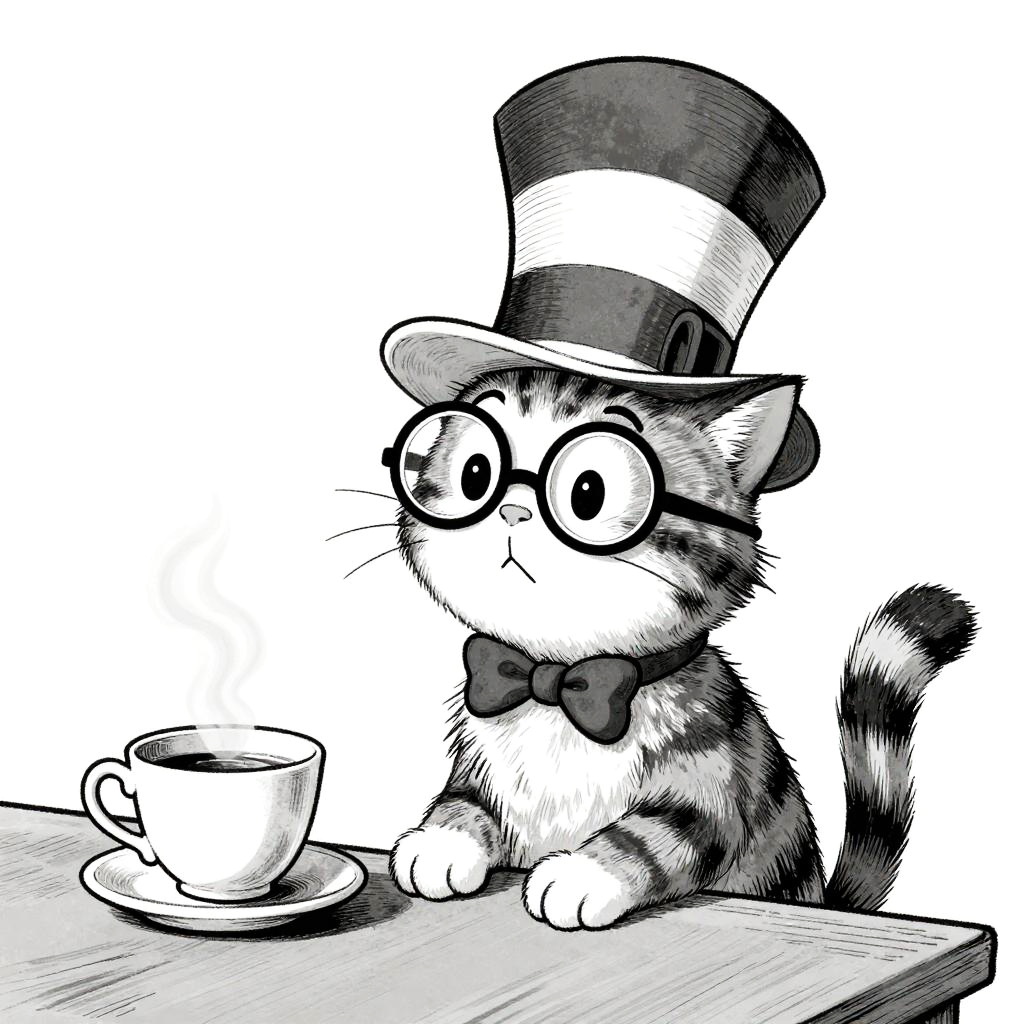 Cat in the hat with glasses, vintage storybook style, charming black and white cat with thick round glasses and iconic tall hat, sitting next to a steaming teacup on a wooden table