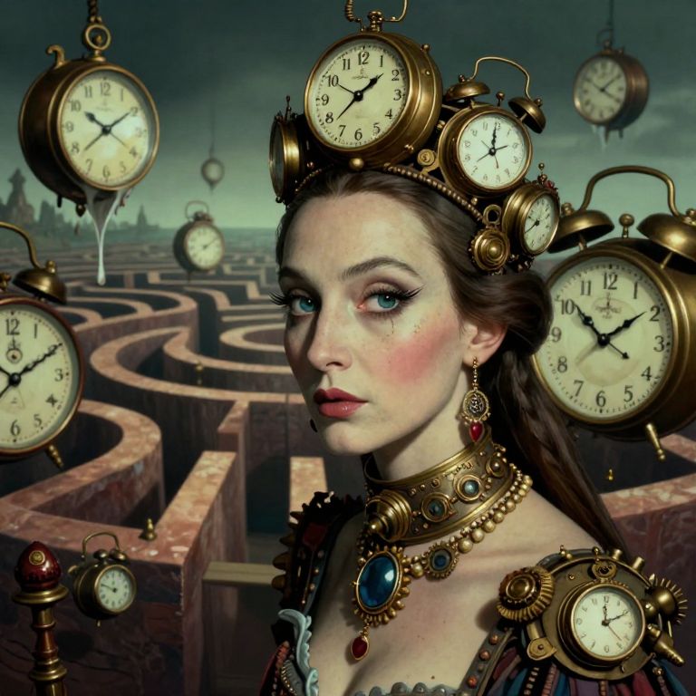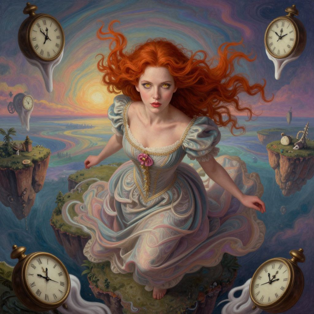 A dreamlike portrait of an enigmatic female figure with elongated limbs, reminiscent of Magritte's surrealistic approach. Seen from below, her captivating blue eyes draw the viewer in as she sits surrounded by an array of clocks, their ticking filling the quiet room. The scene embodies a sense of timelessness and introspection, with the clocks symbolizing the ephemeral nature of life, while her cryptic expression beckons the observer into a realm beyond reality.