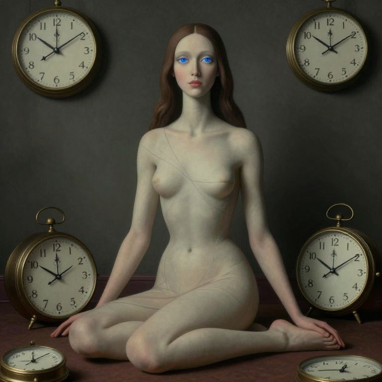 Digital CGI image of a pale, slender, nude woman with long brown hair, sitting on her knees against a dark background. She has striking blue eyes and small breasts. Surrounding her are six antique-style clocks with black hands and numbers, positioned at various angles. The floor and background are a deep maroon, while the clocks have a brass frame. The woman's skin has a faint, almost translucent quality, and her expression is calm and slightly melancholic. The overall atmosphere is eerie and surreal.
