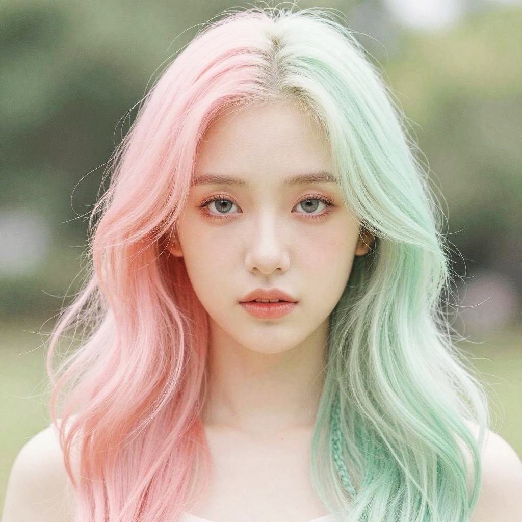 Portrait of a young woman with heterochromatic hair, one side pastel pink and the other mint green, soft natural light, dreamy atmosphere, watercolor painting style, intricate detail