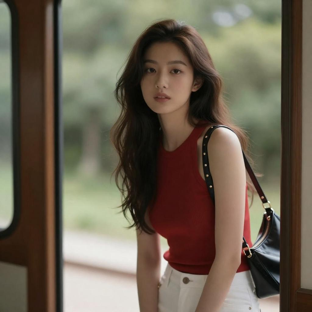 Portrait of a young Asian woman sitting cross-legged on a rock near a calm lake with green mountains in the background. She is wearing a sleeveless denim jacket over a white lace top, paired with ripped denim jeans and white sneakers. The natural outdoor lighting highlights her calm expression, blending casual fashion with a tranquil nature setting.