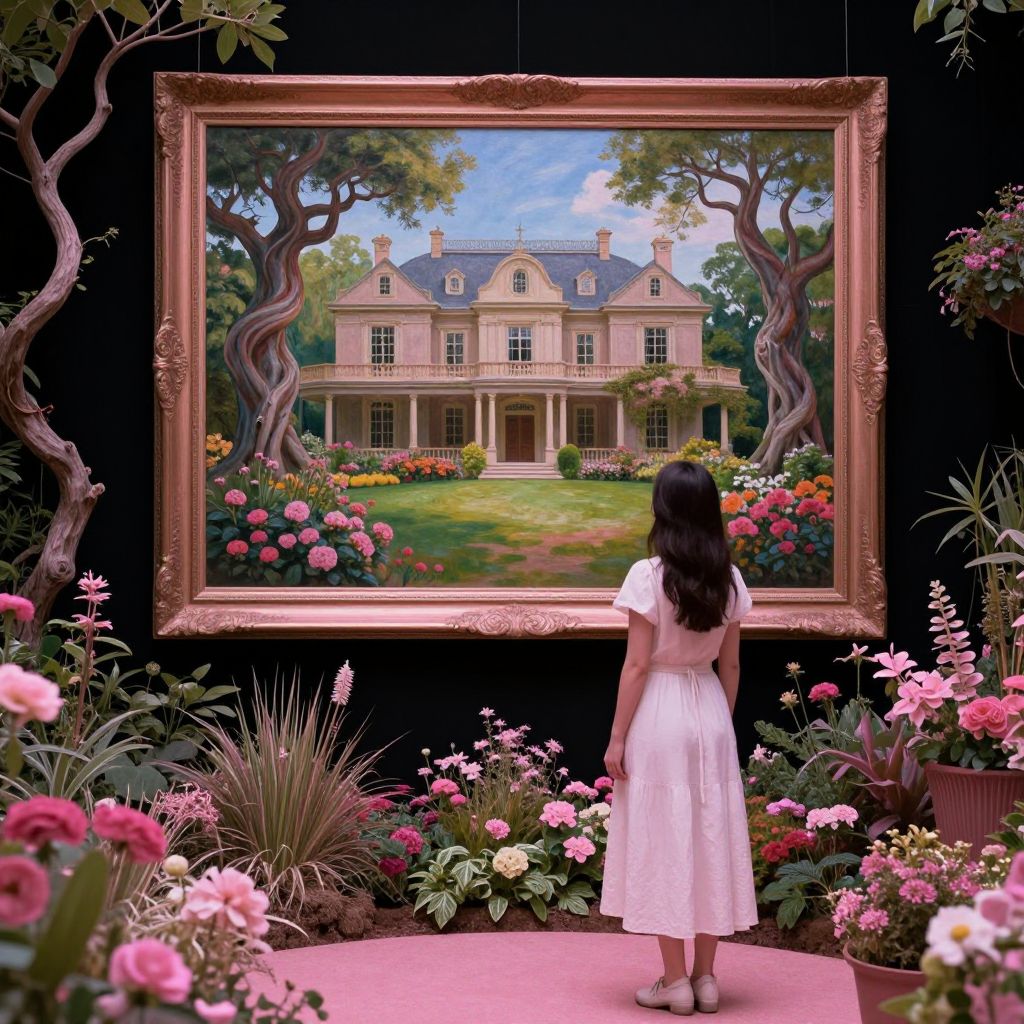 Woman in white dress gazes at a framed painting of a grand house with lush garden, surrounded by vibrant flowers.