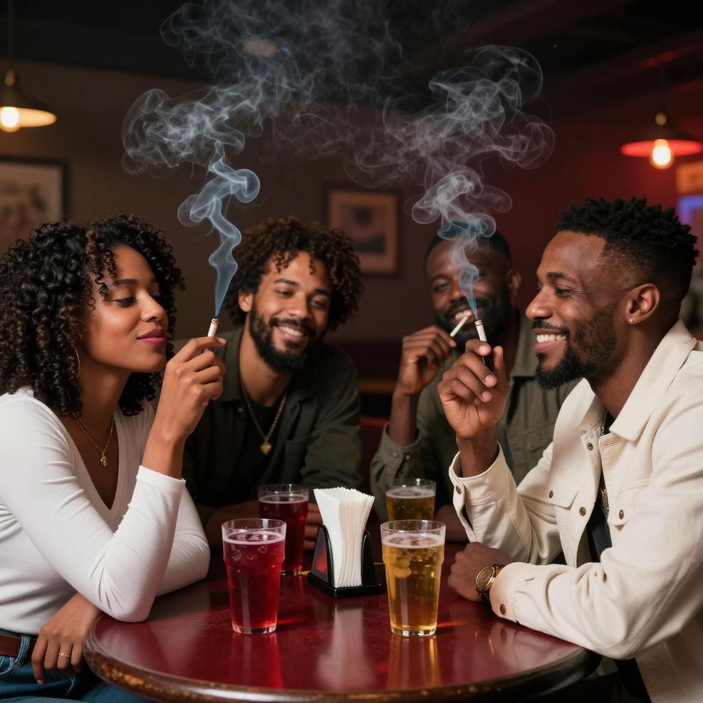 Photograph of four people sitting at a wooden table smoking and drinking. Left: woman in white top, hand near mouth. Center: black man with curly hair, beard, dark shirt, holding glass. Right: black man in gray tracksuit, smoking. Back: Asian woman with short gray hair, black top, looking forward. Table with drinks, ashtray, and cigarette smoke. Warm, dim lighting.