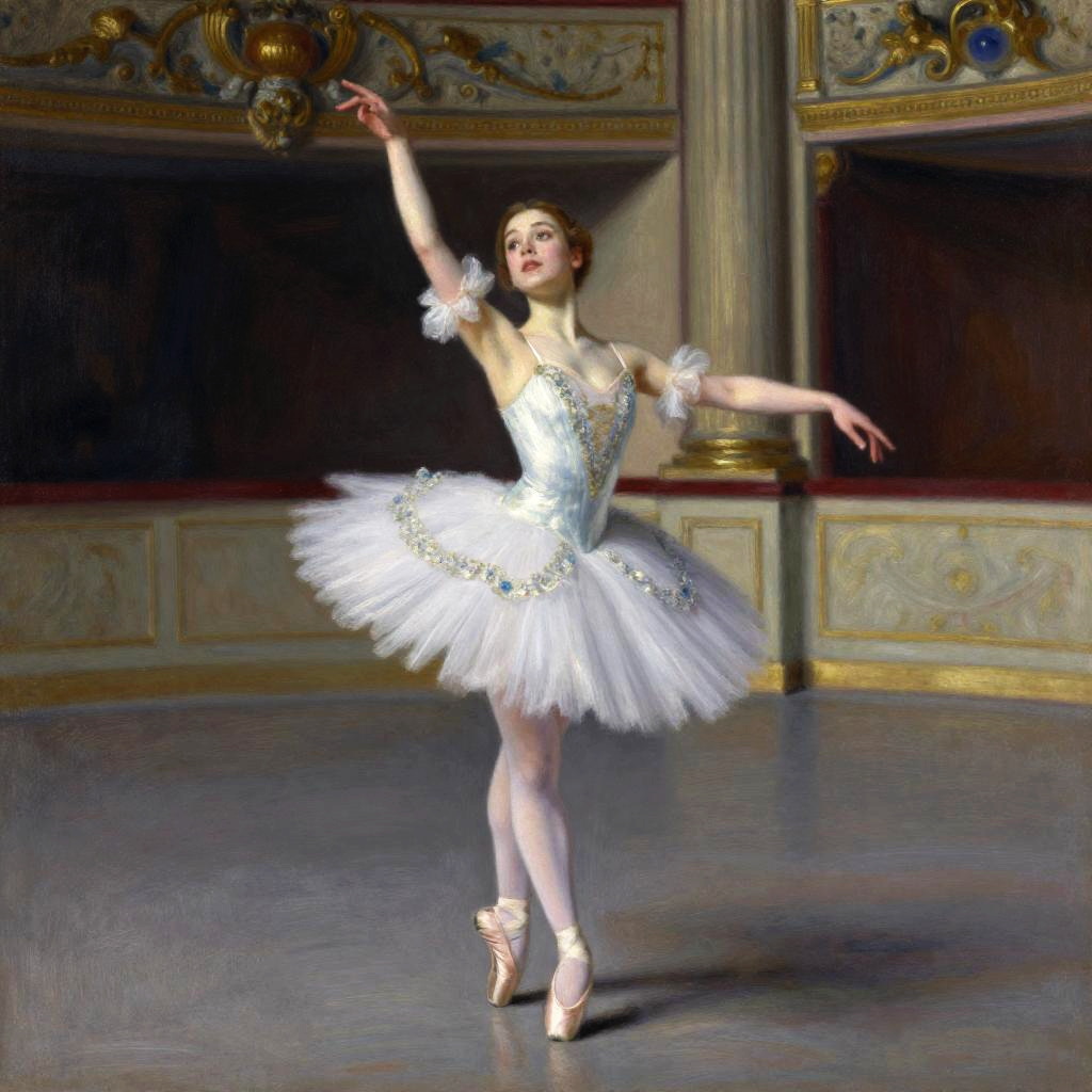 Realistic photo.Portrait of a graceful ballerina in the style of a Leonardo Da Vinci oil painting, with intricate and meticulous brushstrokes. Extremely fine detailing, realistic features, and a classic, timeless look, staring directly at the camera for a powerful presence realistic photo