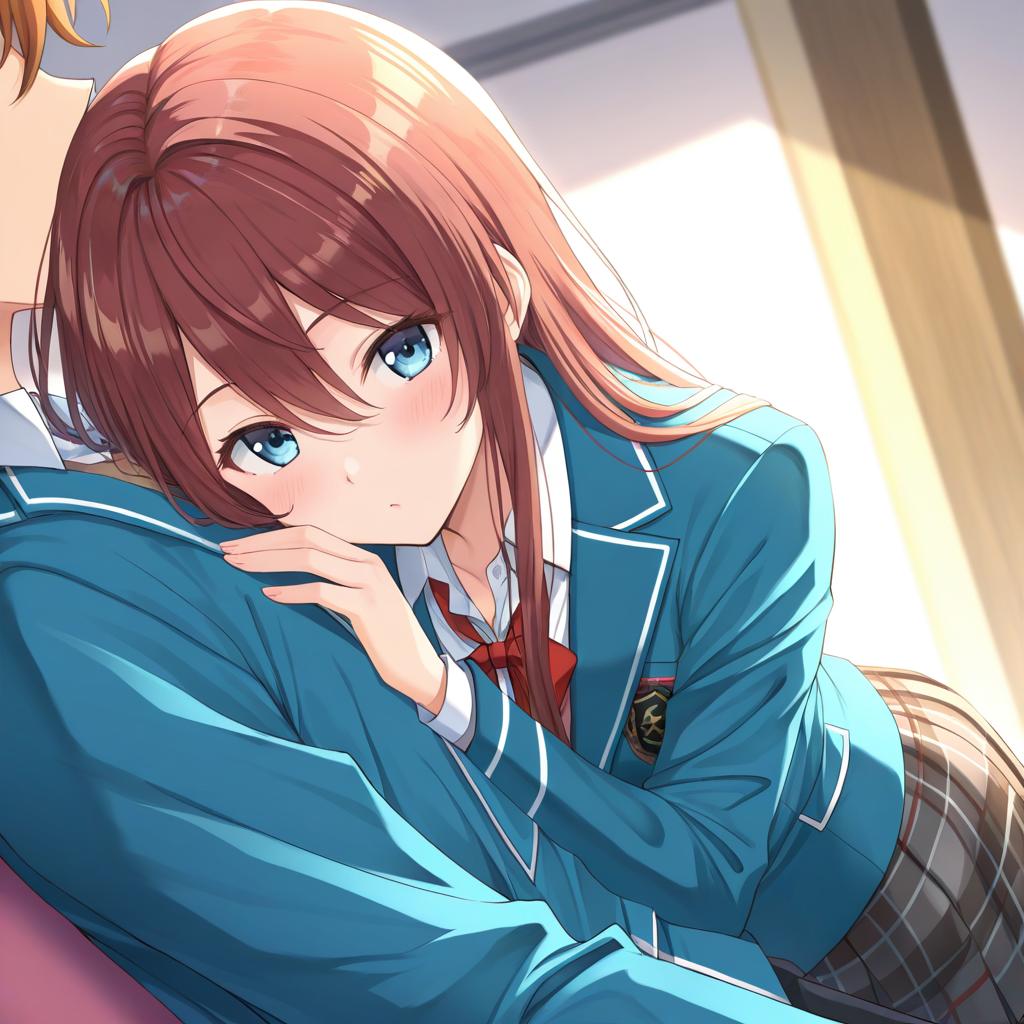 Anime-style illustration of a girl with long brown hair and blue eyes wearing a Yumenosaki school uniform. She is dressed in a blue blazer with white trim, a white collared shirt, a red bow tie, and a gray plaid skirt. The girl is leaning forward with a gentle expression. The image features soft lighting and a blurred, neutral indoor background.