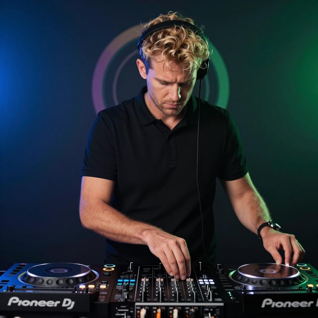 Male DJ with short, curly blonde hair, wearing a black polo shirt, standing behind two Pioneer DJ mixers. He is adjusting the right mixer with his right hand, left hand on the left mixer. Dim, colorful background with circular patterns. Blue and green lighting. Intense focus. Two DJ mixers with visible labels and controls.