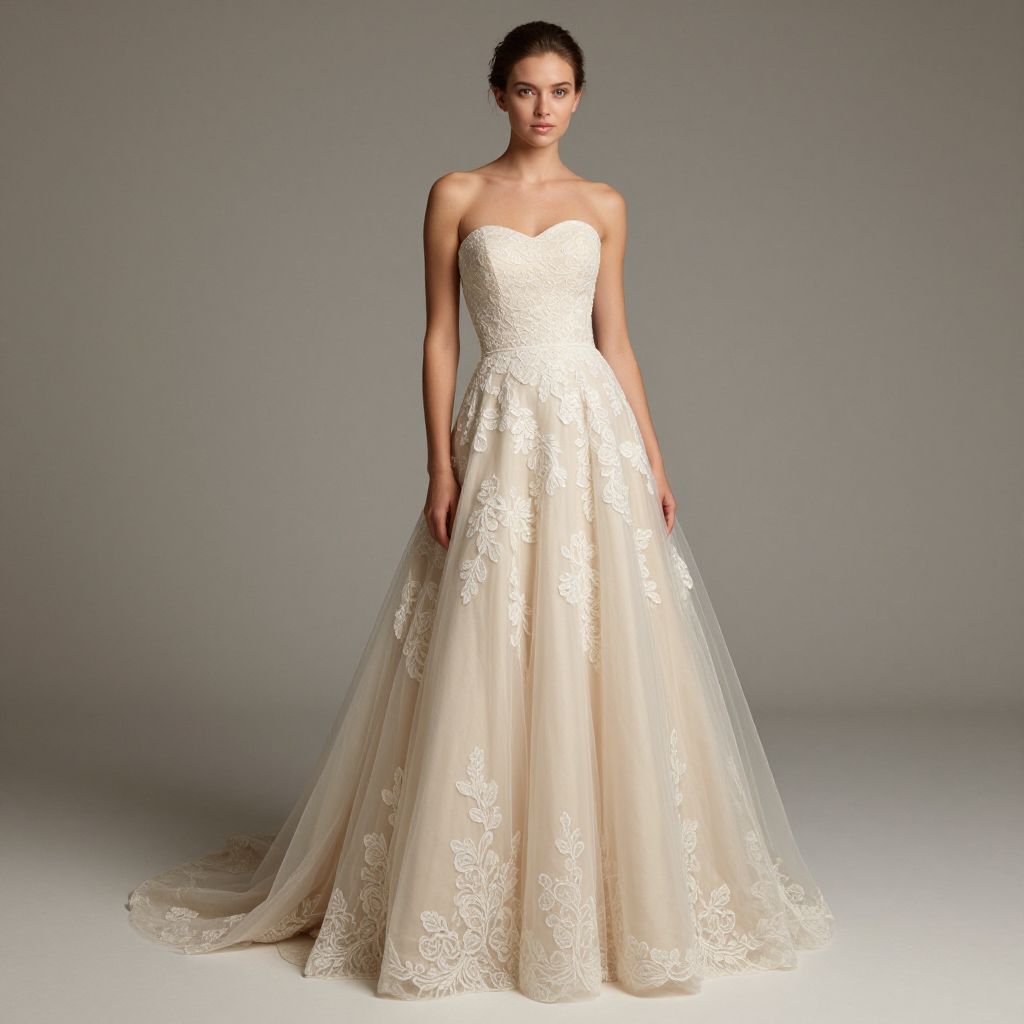 Model showcasing a strapless champagne wedding dress featuring intricate lace appliqués and a flowing tulle skirt, exuding elegance and sophistication against a neutral backdrop.