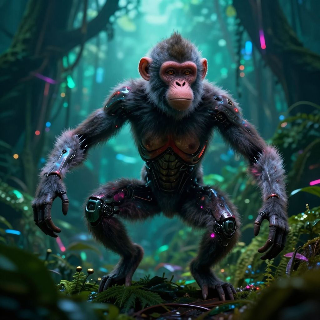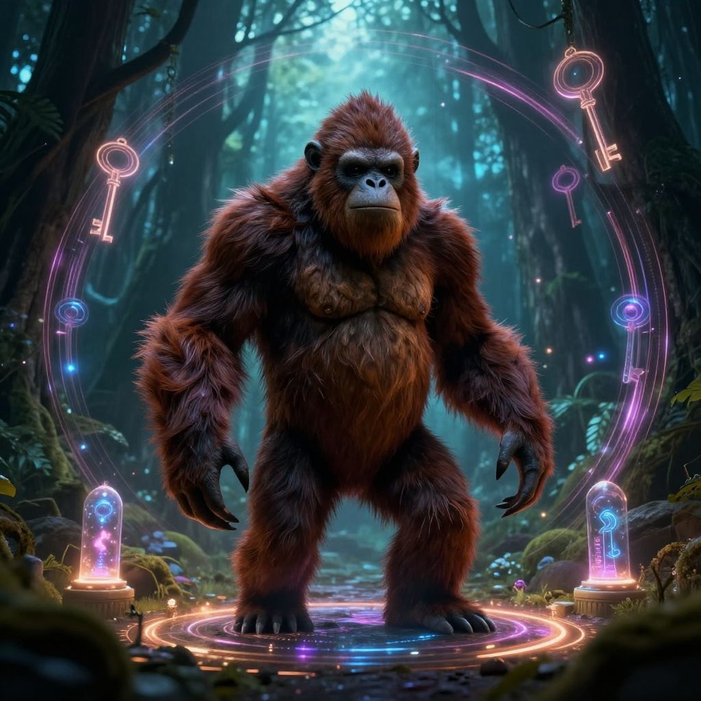 Masterpiece, detailed, cinematic lighting, cute scary monster, sasquatch, cryptid large humanoid ape-like creature, brown fur, stands upright, long arms, elusive, mysterious, forest-dwelling, ancient magical academy, hum of dimensions ethereal plane portal room, vortex frames, dimensional keys, portal generators, transdimensional security, funereal, neon glow, glowing, shining