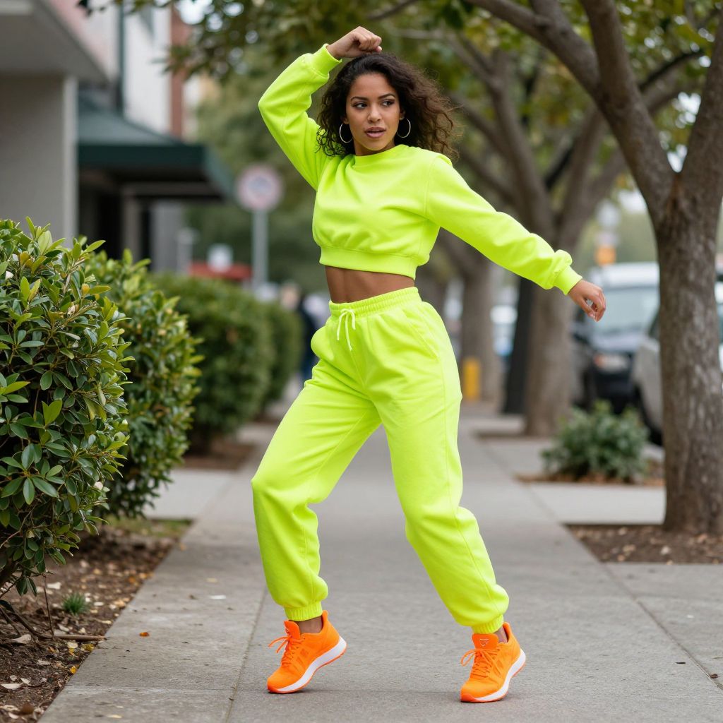 Photograph of a young woman with medium brown skin and long black hair, striking a confident pose on a tree-lined sidewalk. She wears a bright neon yellow crop top and matching loose joggers, paired with vivid orange sneakers. Her right arm is raised with a fist, and her left arm extends to the side. The background features lush green hedges, tall trees, and blurred cityscape elements. The overcast lighting enhances the neon colors of her outfit, making her stand out prominently against the muted, natural tones of the environment.