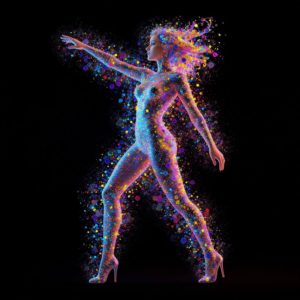 Neon-colored, digital silhouette of a dancing woman with outstretched arms and high heels, surrounded by vibrant, multicolored splatters on a