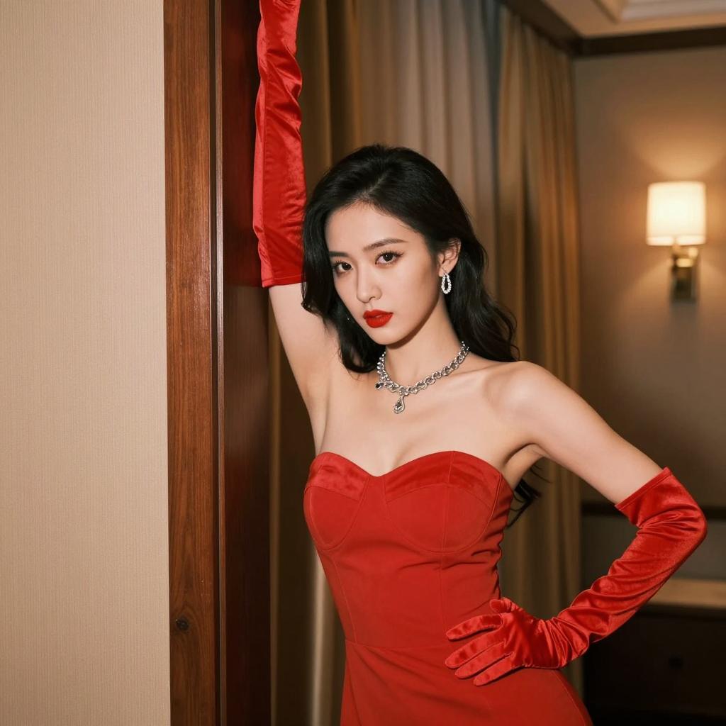 Brown-haired woman with fair skin, wearing black strapless mini dress with silver straps, black elbow-length gloves, and black thigh-high stockings, leaning forward with hands near knees. Background: ured brown wall, wooden slatted stairs, reflective glass panel on the right. Intense expression.
