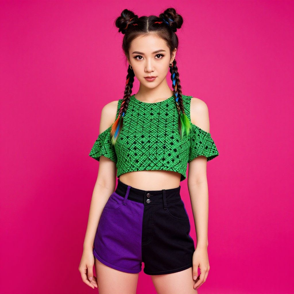 Photograph of an East Asian woman with fair skin and long braided hair styled in two space buns. She wears a green, patterned, off-the-shoulder crop top with short sleeves and high-waisted black shorts with a purple panel on the right. The background is a solid, vibrant pink. Her expression is neutral, and she stands with her arms relaxed at her sides. The image has a bright, pop-art style with bold colors and sharp contrasts.