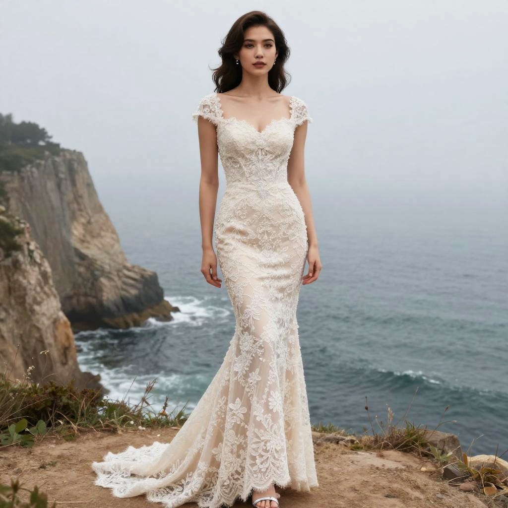 A woman, in the visual style of ufotable, exuding classic elegance in a fitted lace gown with intricate beading and a sweetheart neckline, short cap sleeves, and a mermaid silhouette. She stands by a misty coastal cliff, wearing silver strappy heels and neutral makeup. Sexy. Pretty face and beutiful eyes