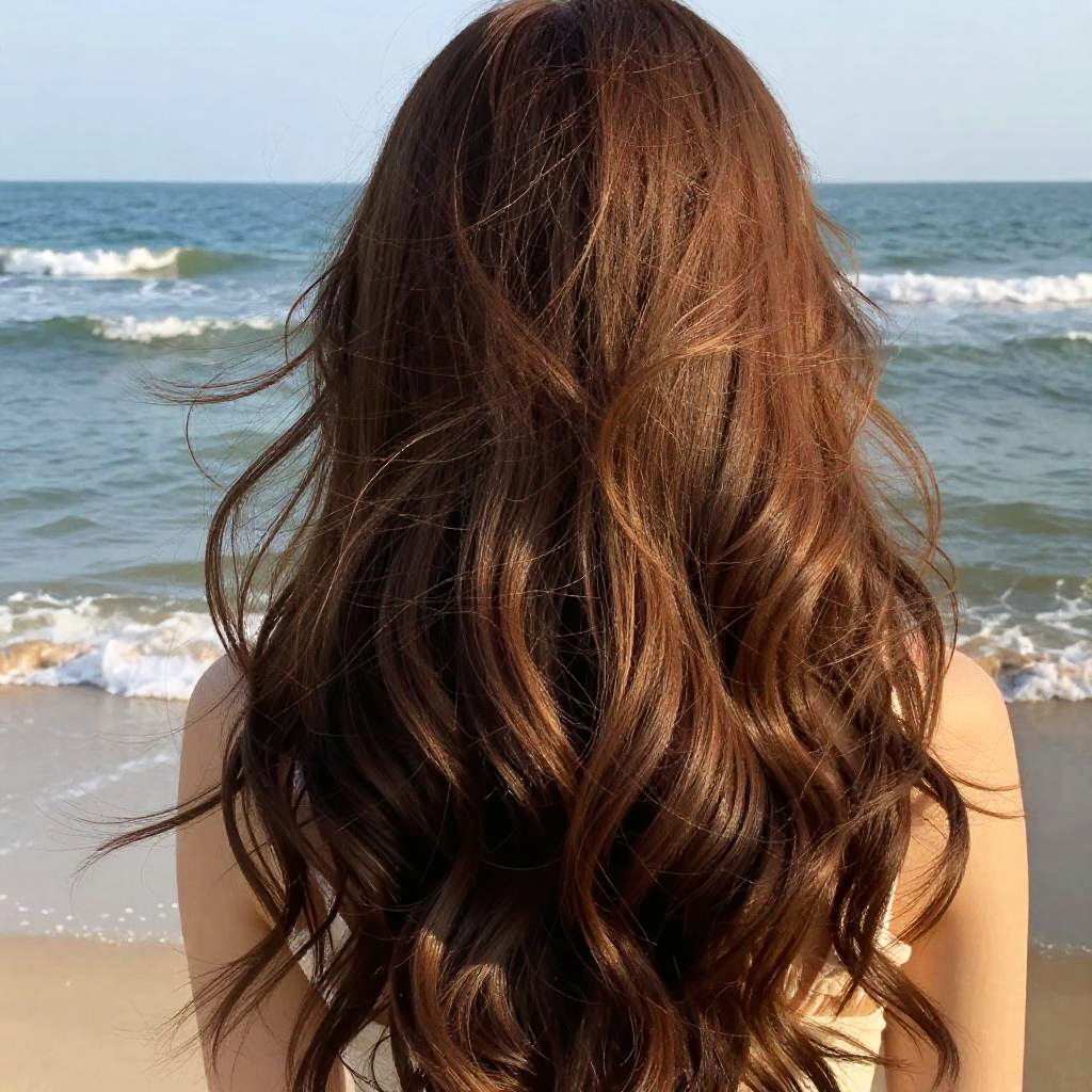 Long brown wavy hair cascading over shoulders, sunlit strands with natural highlights, soft beach waves, detailed texture, realistic style, warm and inviting atmosphere