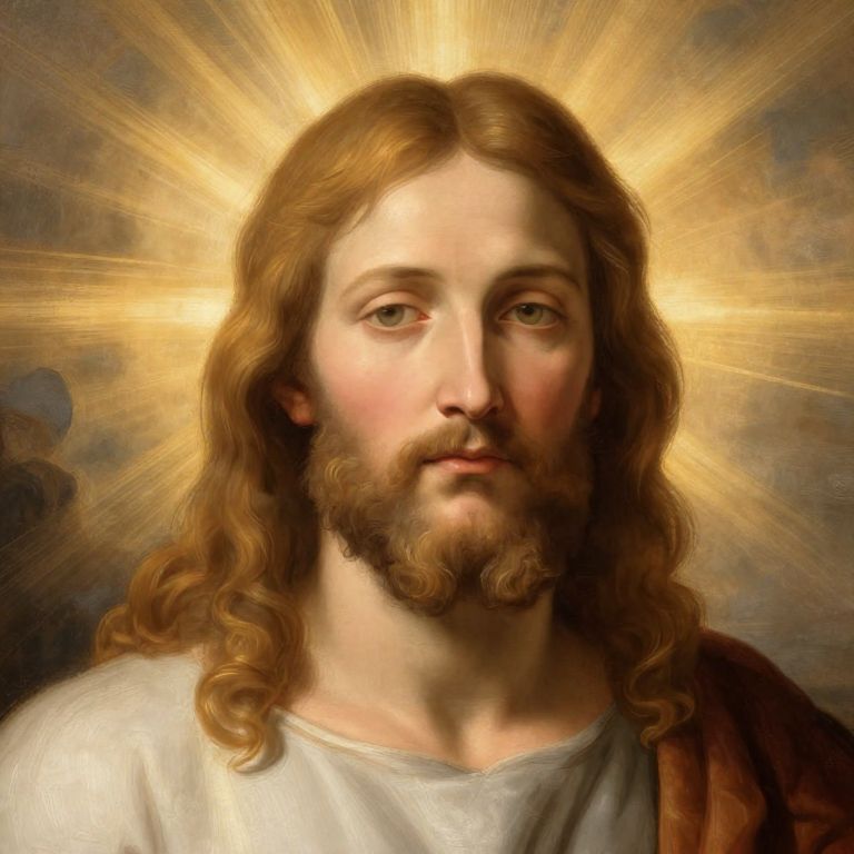 Digital painting of Jesus Christ with a realistic style. He has long, wavy, auburn hair and a full beard. His skin is fair, with soft, pinkish undertones on his cheeks. His eyes are gentle and brown, gazing slightly to the right. A radiant, golden halo surrounds his head, with light beams emanating from behind. He wears a simple, white, tunic with a brown cloak draped over his left shoulder. The background is a dark, muted gradient, highlighting Jesus's face and halo. The image exudes a serene, divine presence.