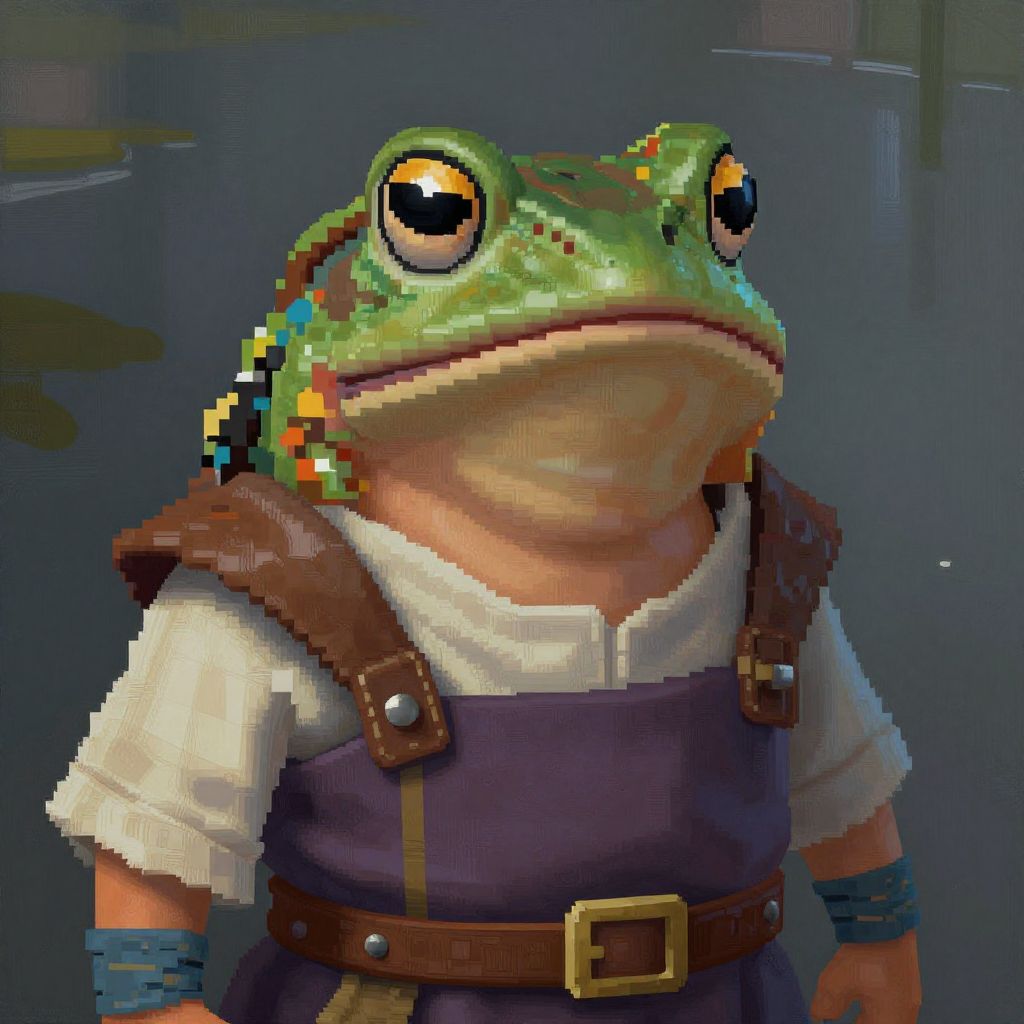 Digital pixel art of a humanoid frog wearing a white shirt, purple vest, brown leather straps, and a belt, with large, expressive eyes.